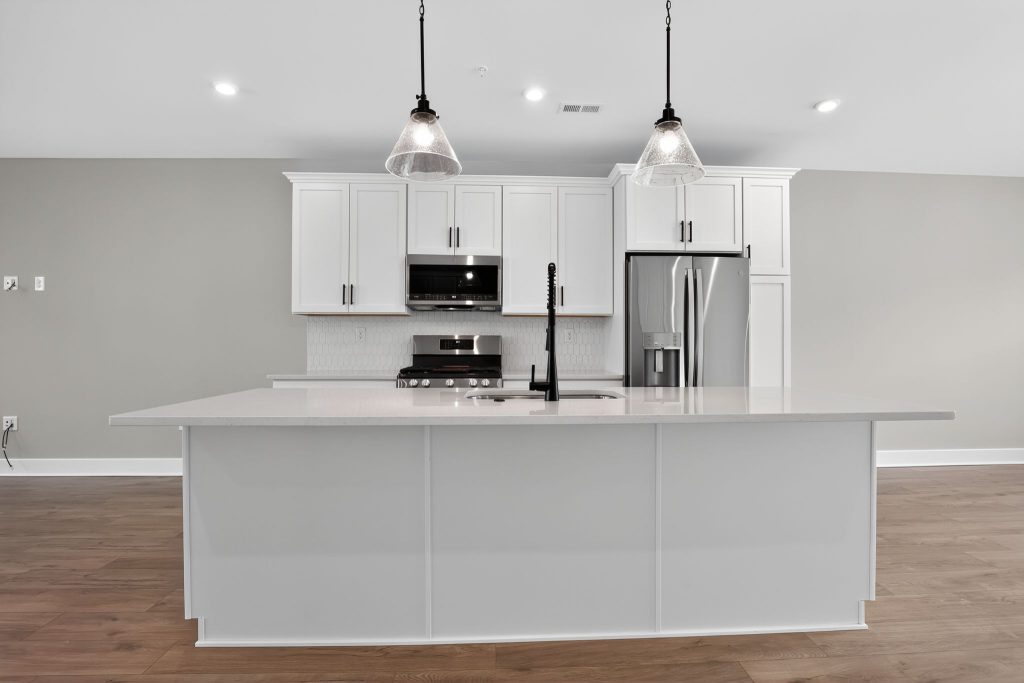 Impressive kitchen with central island, quartz countertops, premium white cabinetry, and tile backsplash